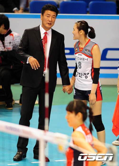 22일 오후 대전 충무실내체육관에서 열린 2011-2012 NH농협 V-리그 여자부 KGC 인삼공사와 IBK 기업은행의 경기, 경기전 인삼공사 박삼용 감독이 임명옥과 이야기를 나누고 있다.
