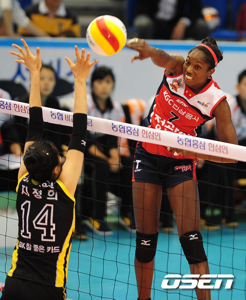 22일 오후 대전 충무실내체육관에서 열린 2011-2012 NH농협 V-리그 여자부 KGC 인삼공사와 IBK 기업은행의 경기, 1세트 인삼공사 몬타뇨가 기업은행 지정희의 블로킹을 피해 강타를 날리고 있다.