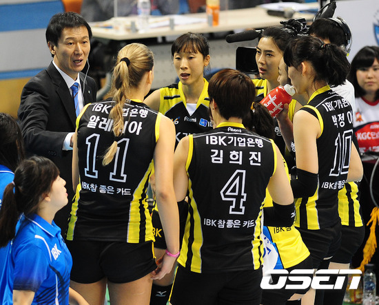 22일 오후 대전 충무실내체육관에서 열린 2011-2012 NH농협 V-리그 여자부 KGC 인삼공사와 IBK 기업은행의 경기, 1세트 기업은행 이정철 감독이 작전타임을 갖고 있다.
