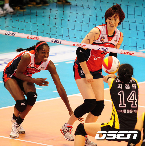 22일 오후 대전 충무실내체육관에서 열린 2011-2012 NH농협 V-리그 여자부 KGC 인삼공사와 IBK 기업은행의 경기, 1세트 인삼공사 몬타뇨와 장소연의 블로킹에 맞고 나온 볼을 기업은행 지정희가 리시브하고 있다.