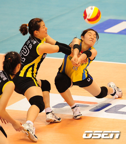 22일 오후 대전 충무실내체육관에서 열린 2011-2012 NH농협 V-리그 여자부 KGC 인삼공사와 IBK 기업은행의 경기, 2세트 기업은행 채선아와 김민주가 부딪히며 리시브를 하고 있다.