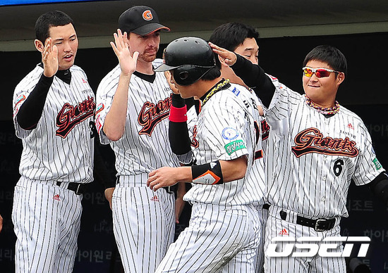 '2011 롯데카드 프로야구 플레이오프' 롯데 자이언츠와 SK 와이번스의 5차전 1회말 3루타를 치고 진루한 김주찬이 전준우의 2루타때 홈을 밟고 동료들의 환영을 받고 있다.