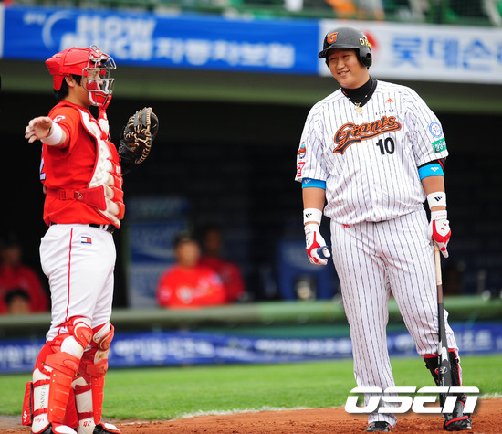 1회말 1사2루 이대호 고의사구로 진루시키자 미소를 지어보이고 있다.