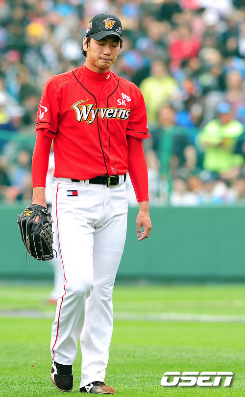 '2011 롯데카드 프로야구 플레이오프' 롯데 자이언츠와 SK 와이번스의 5차전 1회말 수비서 3루타 2루타로 실점을 한 김광현이 이닝을 마치고 인상을 찡그리고 있다.