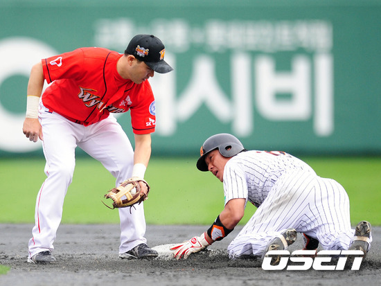 3회말 1사 1루 손아섭 타석때 1루 주자 김주찬 2루 도루에 성공하고 있다.