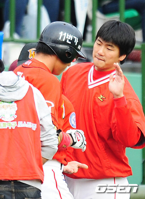 4회초 1사 1루 박정권 역전 투런홈런을 날리고 홈인 김광현의 환영을 받고 있다.