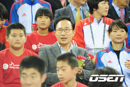 [OSEN= 백승철 인턴기자] 23일 오후 서울 방이동 올림픽공원 SK 올림픽핸드볼경기장에서 열린 한국과 일본과의 2012 런던올림픽 핸드볼 아시아 남자예선 경기, 이명박 대통령이 경기를 관람하고 있다.
