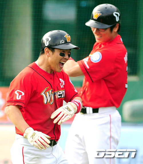 '2011 롯데카드 프로야구 플레이오프' 롯데 자이언츠와 SK 와이번스의 5차전 5회초 2사 1,3루 부첵의 폭투때 홈을 밟은 정근우가 박정권과 기쁨을 나누고 있다.