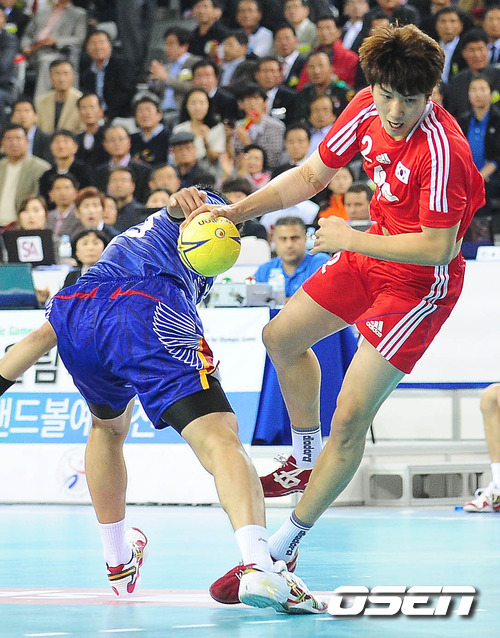 [OSEN= 백승철 인턴기자] 23일 오후 서울 방이동 올림픽공원 SK 올림픽핸드볼경기장에서 열린 한국과 일본과의 2012 런던올림픽 핸드볼 아시아 남자예선 경기 전반 정의경이 일본 수비에 발을 걸려 넘어지고 있다.