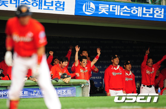6회초 무사 1루 박정권 우월 투런홈런을 날리자 SK 덕아웃 선수들이 환호하고 있다.