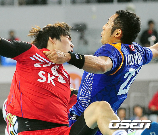 [OSEN= 백승철 인턴기자] 23일 오후 서울 방이동 올림픽공원 SK 올림픽핸드볼경기장에서 열린 한국과 일본과의 2012 런던올림픽 핸드볼 아시아 남자예선 경기 전반 고경수가 일본 수비와 충돌후 넘어지고 있다.