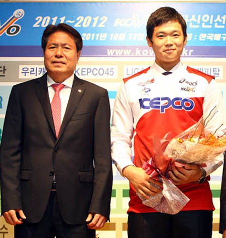 2011~2012 신인 드래프트서 KEPCO45에 1라운드서 지명된 뒤 신춘삼 감독과 나란히 포즈를 취한 서재덕 / KOVO 홈페이지.