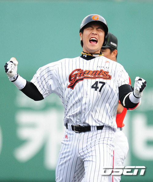 6회말 무사 2,3루 강민호 2타점 적시타를 날리고 2루에서 환호하고 있다.