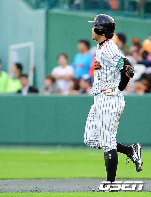 '2011 롯데카드 프로야구 플레이오프' 롯데 자이언츠와 SK 와이번스의 5차전 7회말 1사 2루서 잘맞은 타구가 팬스 바로 앞에서 잡히자 아쉬워 하고 있다.