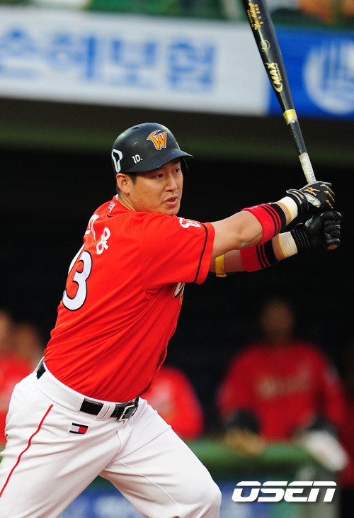 8회초 무사 1,2루 안치용이 우익수 앞에 떨어지는 1타점 적시타를 날리고 있다.