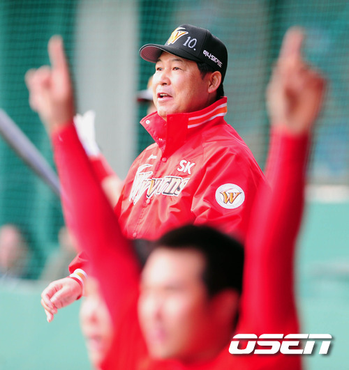 '2011 롯데카드 프로야구 플레이오프' 롯데 자이언츠와 SK 와이번스의 5차전 8회초 무사 2,3루 김강민의 타구가 펜스를 맞고 적시타가 되자 이만수 감독이 좋아하고 있다.