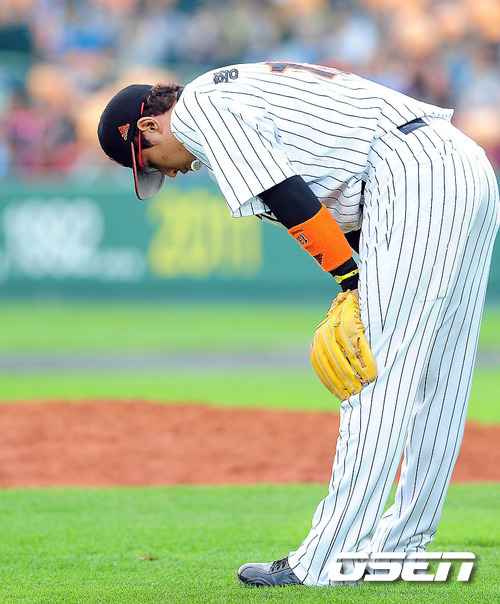 '2011 롯데카드 프로야구 플레이오프' 롯데 자이언츠와 SK 와이번스의 5차전 8회초 무사 1루 박정권의 빗맞은 타구를 황재균이 보이지 않는 실책으로 무사 1,2루를 만들어 주고 아쉬워 하고 있다.