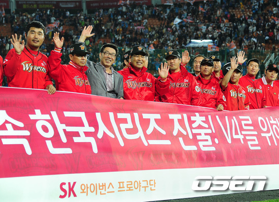 SK 선수들이 플래카드를 들고 5회연속 한국시리즈 진출을 자축하고 있다.