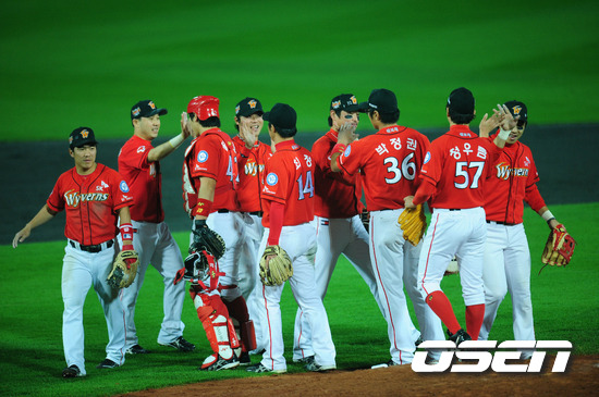 SK 와이번스 선수들이 경기 종료후 승리의 기쁨을 나누고 잇다.