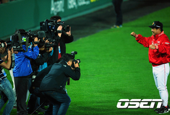 종료후 이만수 감독대행이 사진기자들에게 포즈를 취하며 승리의 기쁨을 나누고 잇다.