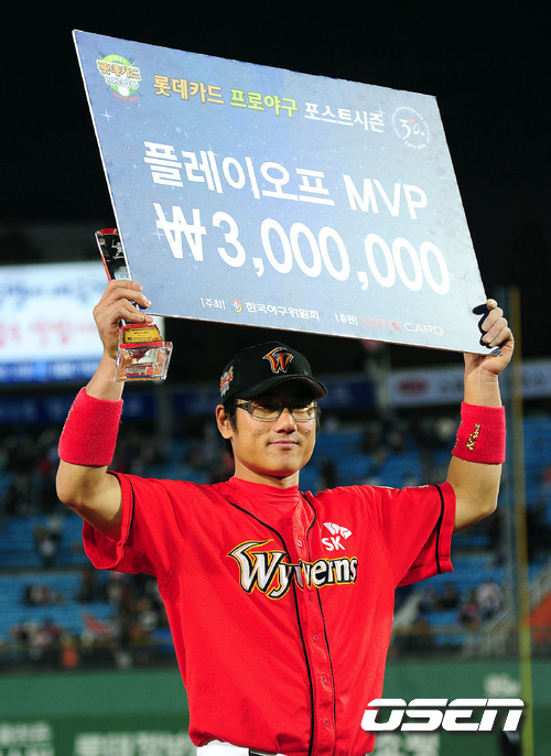 SK 박정권이 플레이오프 mvp를 수상 300만원의 상금을 받고 있다.