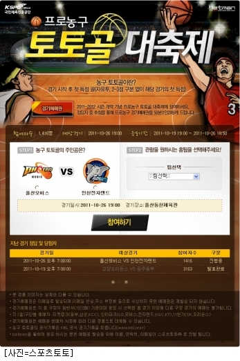 국민체육진흥공단(www.kspo.or.kr)이 발행하는 체육진흥투표권 수탁사업자인 스포츠토토(www.sportstoto.co.kr)가 올 시즌 국내 남자프로농구 KBL을 대상으로 '프로농구 토토골' 이벤트를 개최한다.