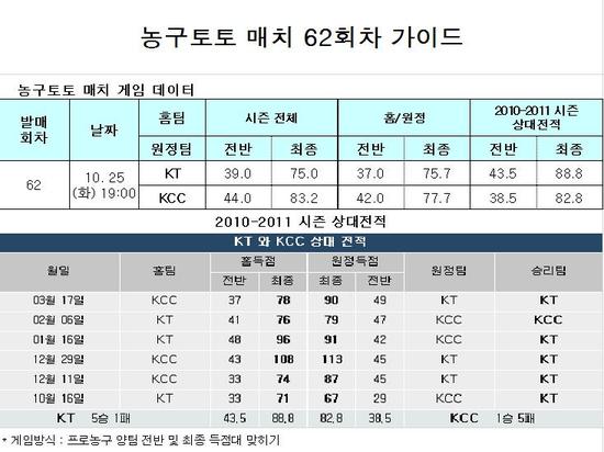 [농구토토] 국민체육진흥공단(www.kspo.or.kr)이 발행하는 체육진흥투표권 수탁사업자인 스포츠토토 공식 온라인 발매사이트인 베트맨(www.betman.co.kr)이 25일 오후 7시 사직실내체육관에서 벌어지는 KT-KCC전 대상 농구토토 매치 62회차 투표율을 중간 집계한 결과, 전체 참가자의 40.13%가 양팀간 10점 이내 박빙 승부를 펼칠 것으로 점쳤다.
