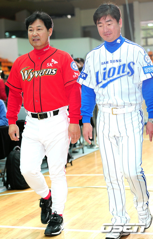 24일 대구 시민체육관에서 벌어진 '2011 롯데카드 프로야구' 한국시리즈 미디어데이에서 류중일 삼성 감독과 SK 이만수 감독이 나란히 입장하고 있다.
