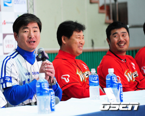 오는 25일 열리는 '2011 롯데카드 프로야구 한국시리즈' 1차전 삼성 라이온즈와 SK 와이번스 경기에 앞서 24일 대구 시민체육관에서 미디어데이 행사가 열렸다.이날 미디어데이 행사에는 삼성은 류중일 감독 진갑용, 최형우 선수가 SK는 이만수 감독 대행과 박정권,이호준 선수가 참석했다.