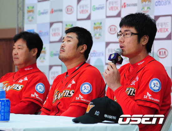 SK 와이번스 박정권이 취재진의 질문에 답변을 하고 있다.