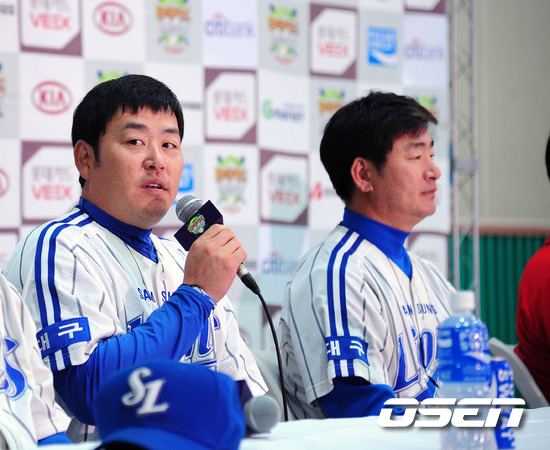 삼성 진갑용이 취재진의 질문에 답변을 하고 있다.