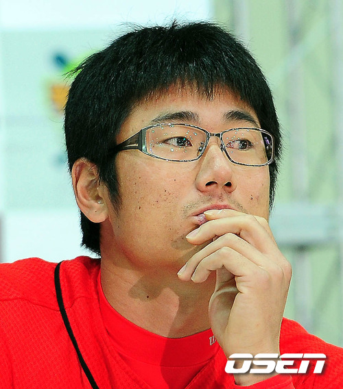24일 대구 시민체육관에서 벌어진 '2011 롯데카드 프로야구' 한국시리즈 미디어데이에서 SK 박정권이 고등학교 2년 후배인 최형우에게 '작년 한국시리즈를 기억하라'며 의미 있는 말을 하고 있다.