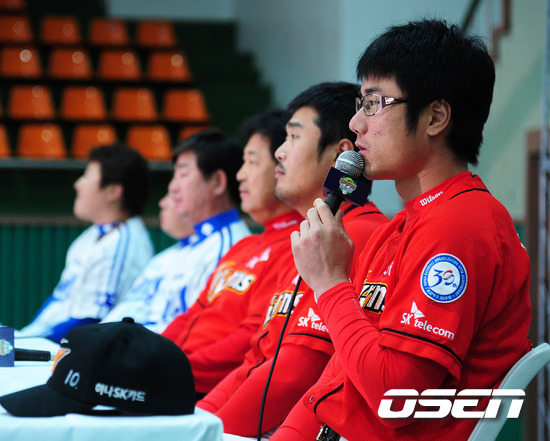SK 박정권이 취재진의 질문에 답변을 하고 있다.