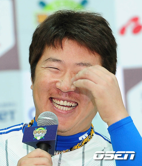 24일 대구 시민체육관에서 벌어진 '2011 롯데카드 프로야구' 한국시리즈 미디어데이에서 삼성 최형우가 고등학교 2년 선배인 SK 박정권의 비밀을 폭로하고 있다.