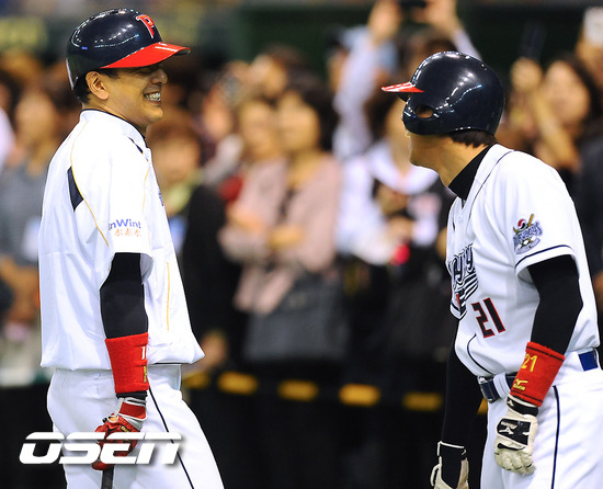 24일 오후 일본 도쿄돔에서 열리는 '제2회 한일드림게임' 경기전 배우 김승우가 오만석과 이야기를 나누고 있다.