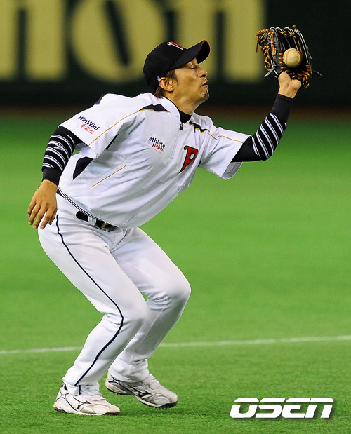 24일 오후 일본 도쿄돔에서 열린 '제2회 한일드림게임' 경기전 배우 주진모가 포구 연습을 하고 있다.