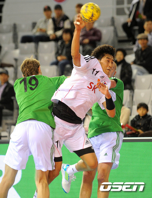 24일 오후 서울 방이동 올림픽공원 SK 올림픽핸드볼경기장에서 열린 한국과 카자흐스탄의 '2012 런던올림픽 핸드볼 아시아 남자예선' 경기, 전반 한국 임덕준이 카자흐스탄의 수비를 뚫고 슛을 시도하고 있다.