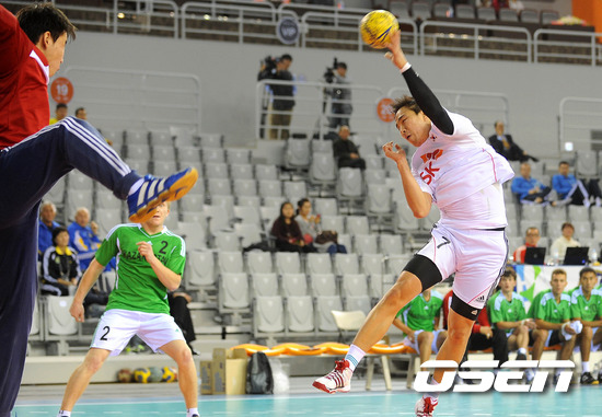 24일 오후 서울 방이동 올림픽공원 SK 올림픽핸드볼경기장에서 열린 한국과 카자흐스탄의 '2012 런던올림픽 핸드볼 아시아 남자예선' 경기, 전반 한국 정수영이 카자흐스탄의 수비를 뚫고 슛을 시도하고 있다.