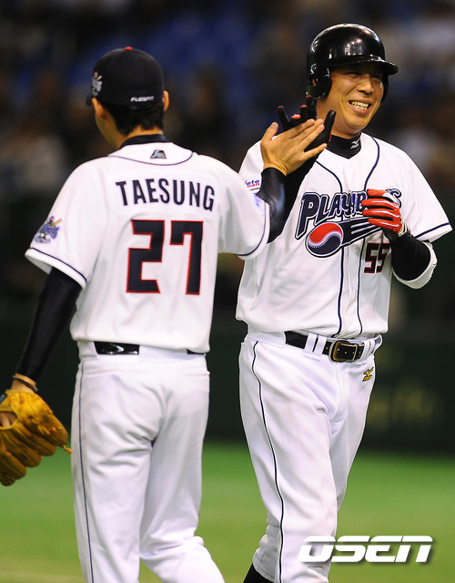 24일 오후 일본 도쿄돔에서 열린 '제2회 한일드림게임' 경기 4회말 공수교대때 병살아웃된 플레이보이즈 안길강이 이태성과 하이파이브를 하며 미안함을 보이고 있다.