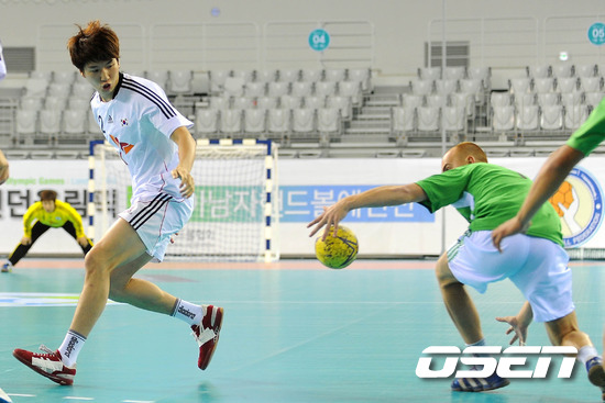 24일 오후 서울 방이동 올림픽공원 SK 올림픽핸드볼경기장에서 열린 한국과 카자흐스탄의 '2012 런던올림픽 핸드볼 아시아 남자예선' 경기, 전반 한국 정의경이 동료의 패스를 놓치고 있다.