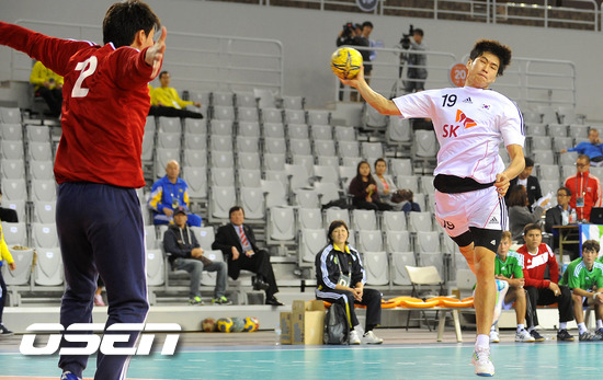 24일 오후 서울 방이동 올림픽공원 SK 올림픽핸드볼경기장에서 열린 한국과 카자흐스탄의 '2012 런던올림픽 핸드볼 아시아 남자예선' 경기, 전반 한국 정한이 카자흐스탄의 수비를 뚫고 슛을 시도하고 있다.