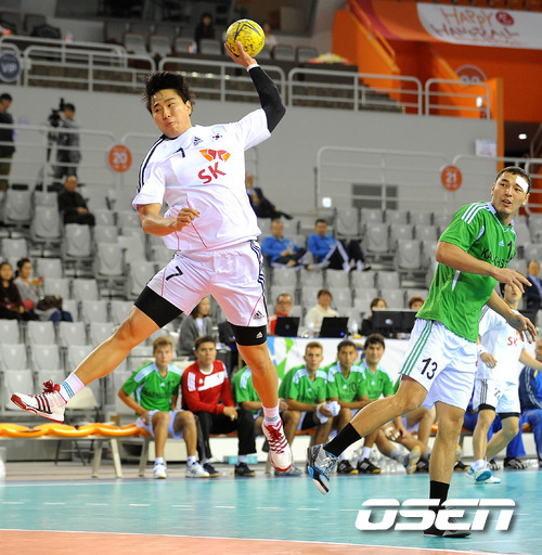 24일 오후 서울 방이동 올림픽공원 SK 올림픽핸드볼경기장에서 열린 한국과 카자흐스탄의 '2012 런던올림픽 핸드볼 아시아 남자예선' 경기, 전반 한국 정수영이 카자흐스탄의 수비를 뚫고 슛을 시도하고 있다.