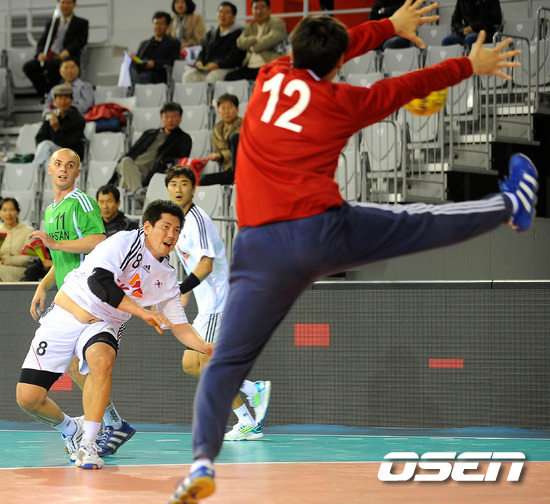 24일 오후 서울 방이동 올림픽공원 SK 올림픽핸드볼경기장에서 열린 한국과 카자흐스탄의 '2012 런던올림픽 핸드볼 아시아 남자예선' 경기, 전반 한국 박중규가 카자흐스탄의 수비를 뚫고 슛을 시도하고 있다.