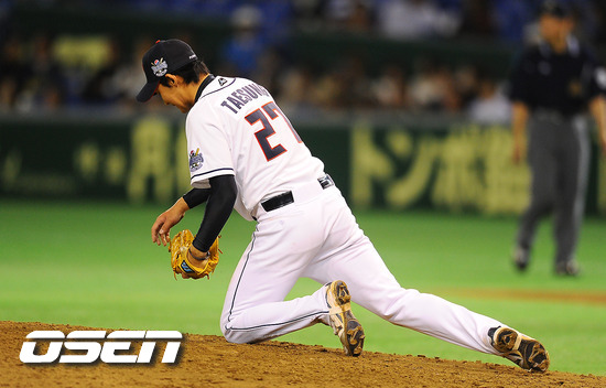 24일 오후 일본 도쿄돔에서 열린 '제2회 한일드림게임' 경기 4회말 플레이보이즈 이태성 투수가 타구를 놓치며 쓰려져 있다.