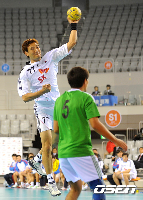 24일 오후 서울 방이동 올림픽공원 SK 올림픽핸드볼경기장에서 열린 한국과 카자흐스탄의 '2012 런던올림픽 핸드볼 아시아 남자예선' 경기, 후반 한국 윤경신이 카자흐스탄의 수비를 뚫고 슛을 시도하고 있다.