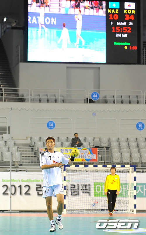 24일 오후 서울 방이동 올림픽공원 SK 올림픽핸드볼경기장에서 열린 한국과 카자흐스탄의 '2012 런던올림픽 핸드볼 아시아 남자예선' 경기, 후반 한국 윤경신이 공을 돌리고 있다.