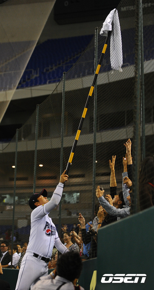 경기종료 후 플레이보이즈 공형진이 펜스에 걸린 옷을 넘겨주고 있다. / soul1014@osen.co.k