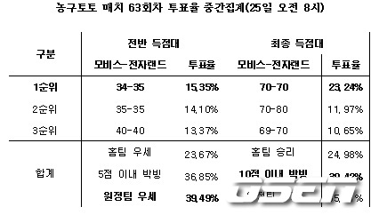 원정팀 전자랜드의 승리를 예상한 참가자는 35.61%로 집계됐고, 나머지 24.98%는 홈팀 모비스의 승리를 전망했다.