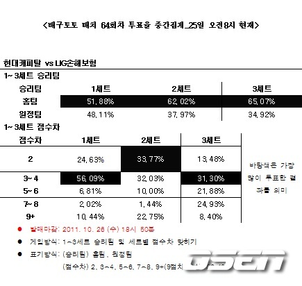 1~3세트 승리팀과 점수차를 알아맞히는 배구토토 매치 게임에서 세트별 예상 승리팀은 1세트(51.88%), 2세트(62.02%), 3세트(65.07%) 모두 현대캐피탈로 나타났다.