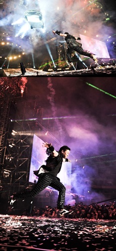 두 장의 사진 속 싸이는 두 발이 공중에 떠있어 마치 무대 위를 날아다니는 것처럼 보였다. 사진은 싸이가 얼마나 열정적으로 공연했는지 상상할 수 있게 한다.